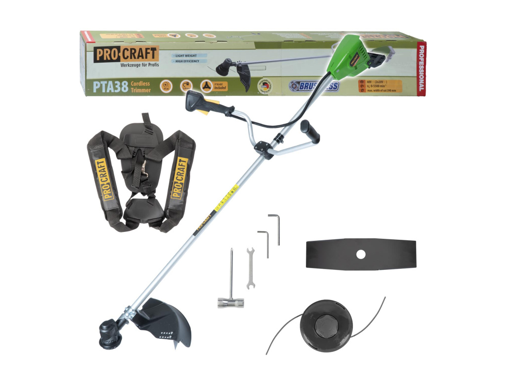 AKU křovinořez Procraft PTA38 je určen k sečení a vyžínání travnatých ploch, k odstranění náletů plevelů. Silný bezuhlíkový tichý motor s otáčkami až 5500 zaručuje dlouhou bezporuchovou práci. Možnost plynulé regulace otaček sečení v závislosti na hustotě a síle porostu a požadavku na přesnost práce. Stroj je dodávaný v kartonu se strunovou hlavou, 3.zubím nožem, jednoramenným popruhem a montážním klíčem – bez akumulátoru a nabíječky. Balení karton.