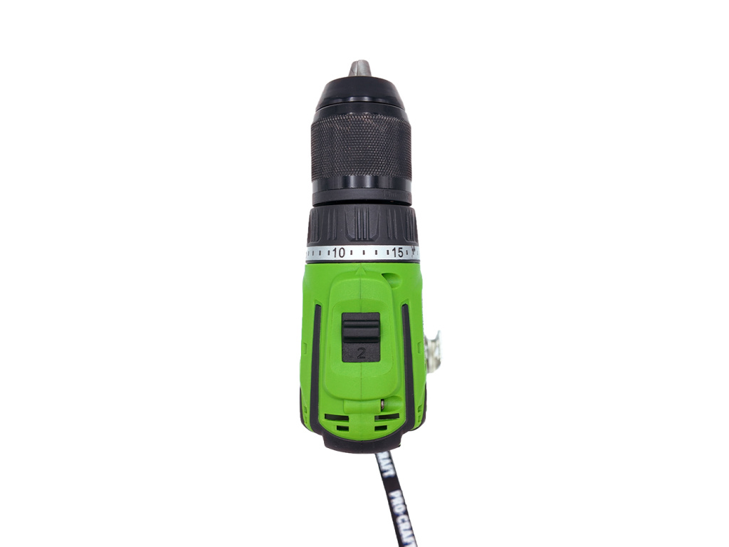 Celokovové sklíčidlo Bezuhlíkový motor Integrovaná LED svítilna, 2 rychlosti, plynulá regulací otáček Kroutící moment: 50Nm Otáčky: 0-400/0-1400min Použitelný průměr vrtáku: 13mm