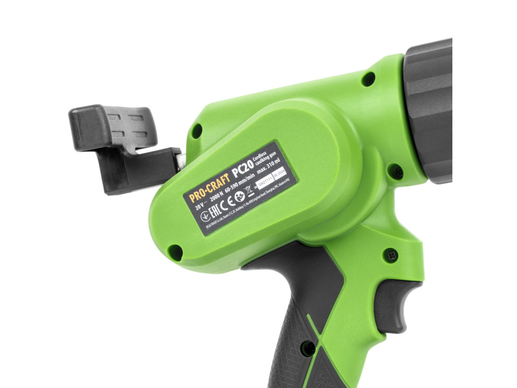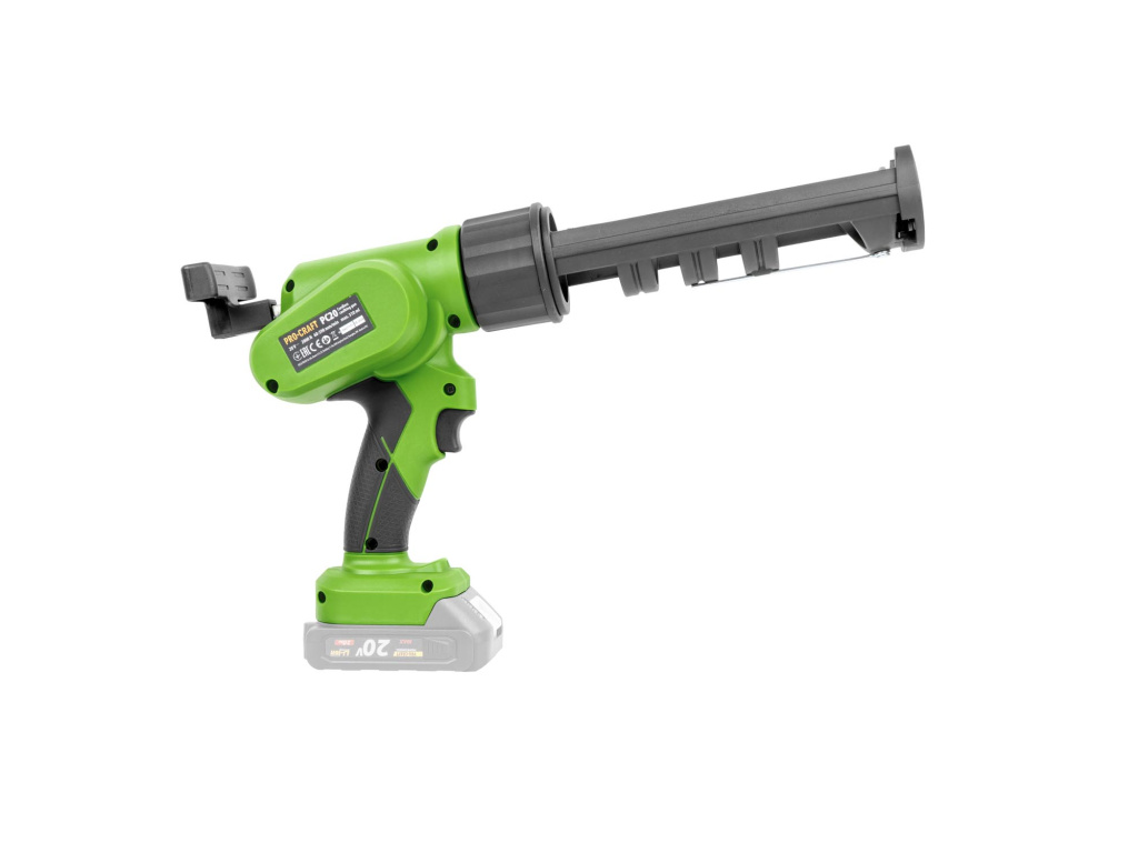 Aku pistole na tmel Procraft PC20 s nastavitelnou rychlostí 60–590 min⁻¹ a maximální silou tlaku 2000 N. Kapacita 280–310 ml, lze dokoupit nástavec pro tuby 600 ml. Ideální pro přesnou aplikaci tmelů a lepidel.