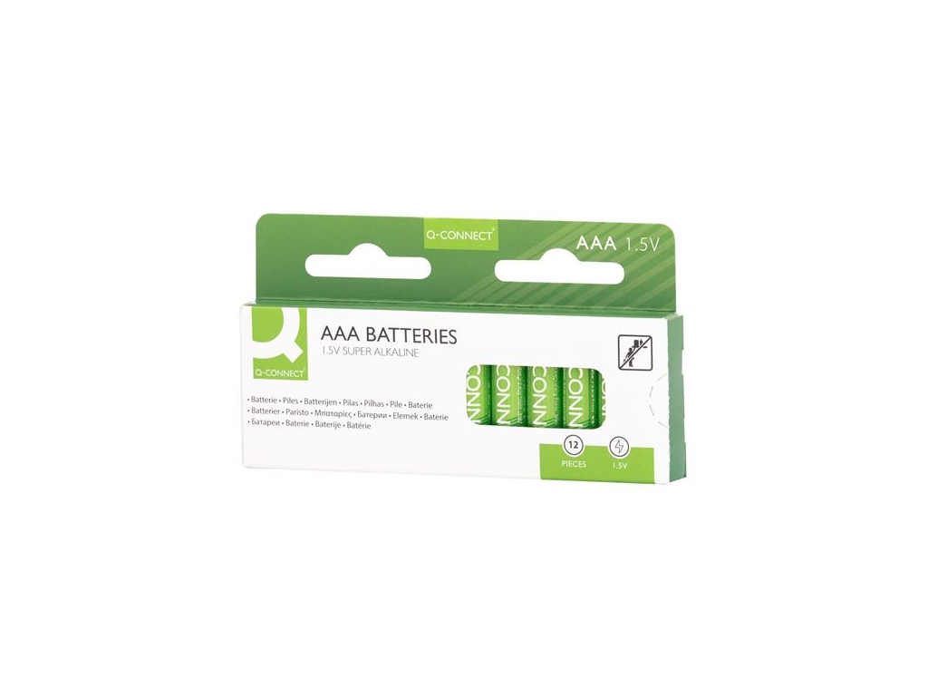 Tužkové baterie typu AAA značky Q-Connect bez obsahu rtutiBalení obsahuje 12 baterií v krabičce Barva: zelenáTechnické informace:Kapacita: 1150 mAhNapětí: 1.5 VChemické složení: Zinek-mangan (bez rtuti a kadmia)