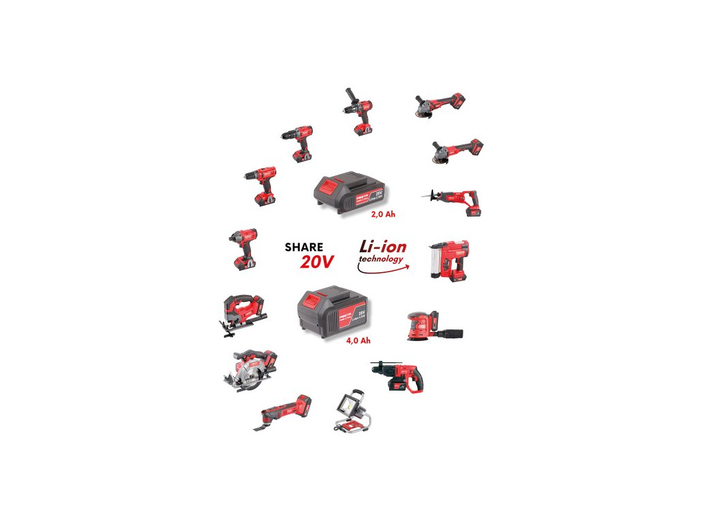 - FESTA SHARE 20 V - AKU bruska je součástí skupiny výrobků s možností využívat Li-ion batarie 2.0 Ah a 4.0 Ah ve všech strojích takto označených
