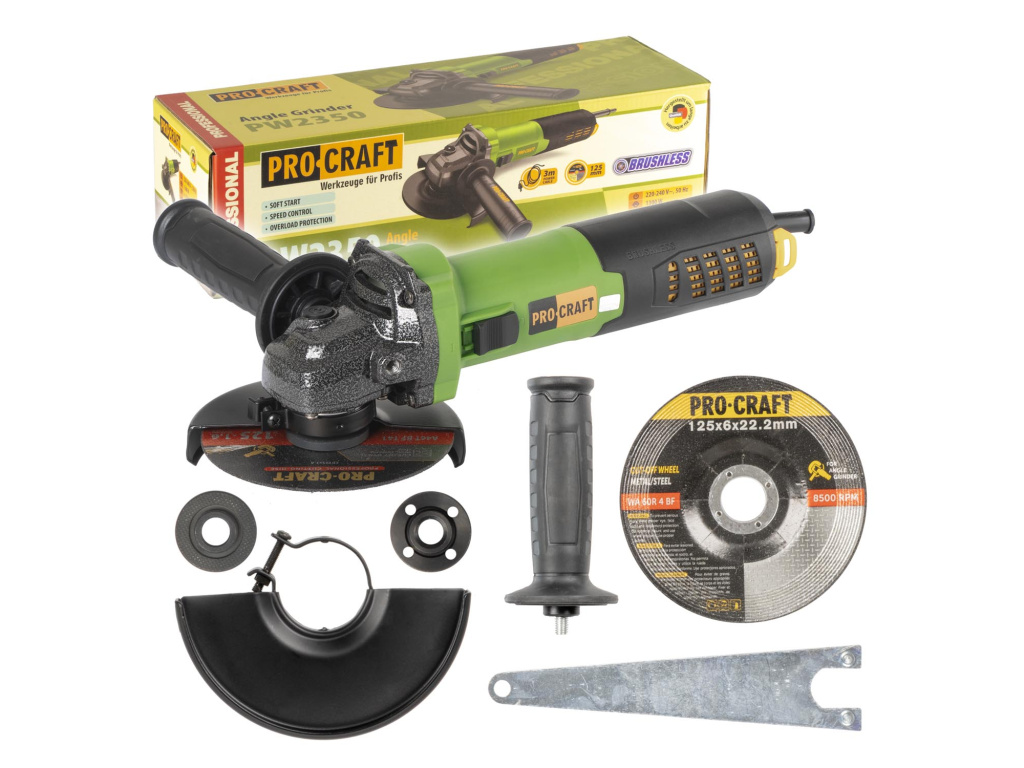 Bruska úhlová Procraft PW2350 Brushless Součástí balení: montážní klíč Příkon: 1300W bezuhlíkový motor Průměr kotouče: 125mm Otáčky: 11000min, regulace otáček Hmotnost: 1,7kg