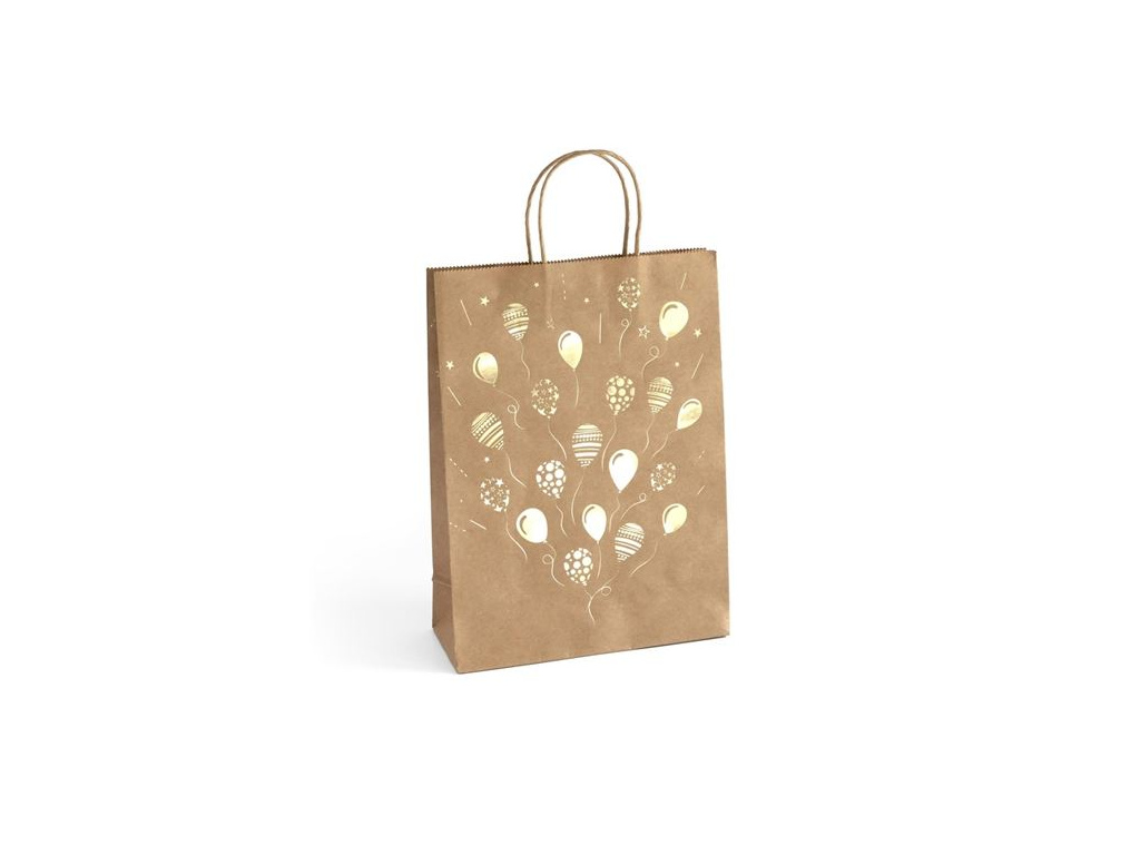 taška z kraftového papíru s ozdobnými zlatými obrázky balónků alternativa igelitových tašek taška je lepená, má ploché dno, kroucené ucho rozměr 33x10x24 cm gramáž 130g/m2 balení 5 ks