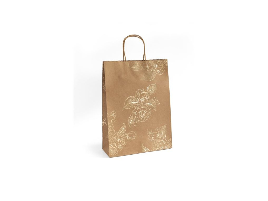 taška z kraftového papíru s ozdobnými zlatými květy alternativa igelitových tašek taška je lepená, má ploché dno, kroucené ucho rozměr 33x10x24 cm gramáž 130g/m2 balení 5 ks