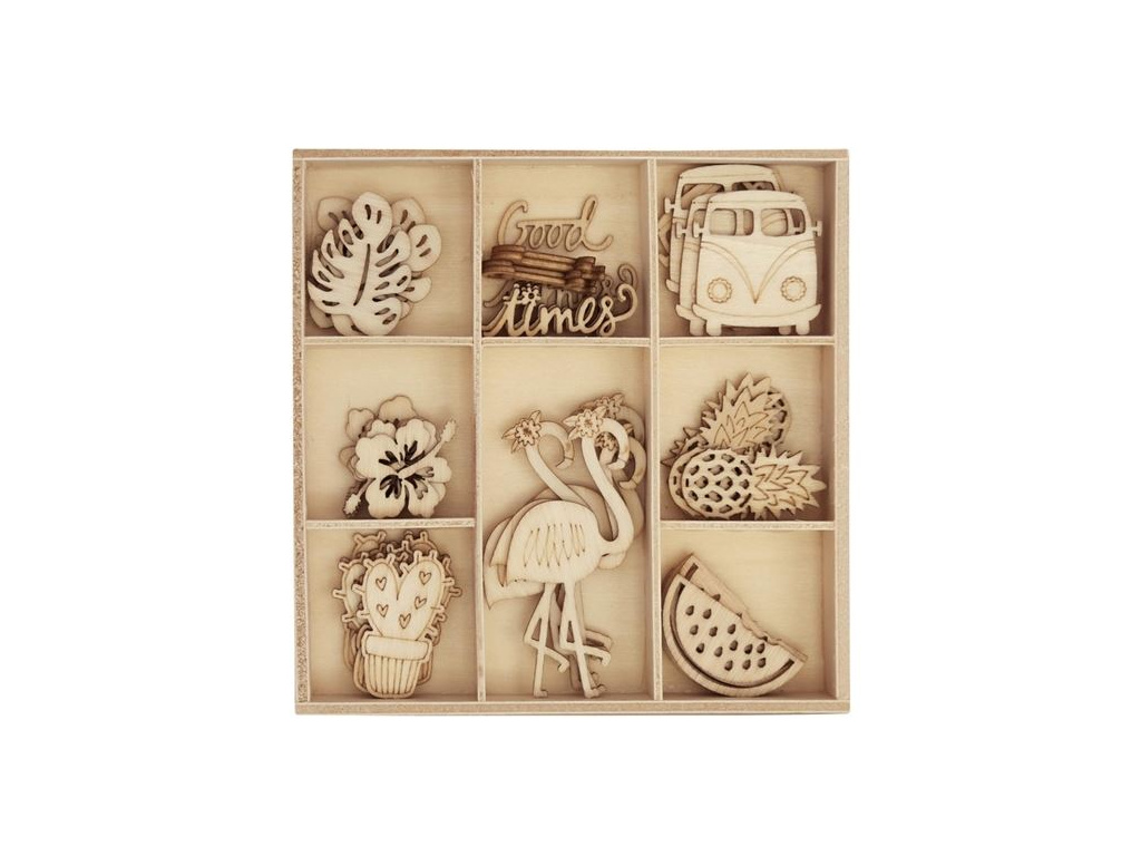dřevěné dekorace (téma tropic / dovolená) motivy: 7 různých motivů + nápis "Good times" vhodné k dekoraci, papírovému či jinému tvoření balení obsahuje celkem 40 ks dekorací různé rozměry - např. plameňák cca 5,5cm, kaktus 2,8 cm materiál: přírodní dřevo dekorace jsou v dřevěném boxu ideální pro zdobení přání, krabiček a tašek na drobnosti upozornění: Nevhodné pro děti do 3 let. Nebezpečí polknutí malých části. Obalové části udržujte mimo dosah dětí.