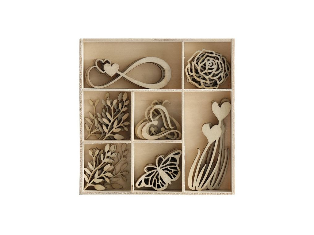 dřevěné dekorace se symboly lásky motivy: 7 různých motivů - srdce, nekonečná láska, tráva se srdíčky, větvičky, motýl, růže vhodné k dekoraci, papírovému či jinému tvoření balení obsahuje 35 ks dekorací velikost dekorací různé rozměry - nekonečná láska 5,6x2,1 cm, tráva se srdíčky 6x1,6 cm, růže 3 cm, srdce 2,3x2,4 cm, motýl 3,8x2 cm, větvička 3,5 cm materiál: přírodní dřevo dekorace jsou v dřevěném boxu ideální pro zdobení přání, krabiček a tašek na drobnosti upozornění: Nevhodné pro děti do 3 let. Nebezpečí polknutí malých části. Obalové části udržujte mimo dosah dětí.