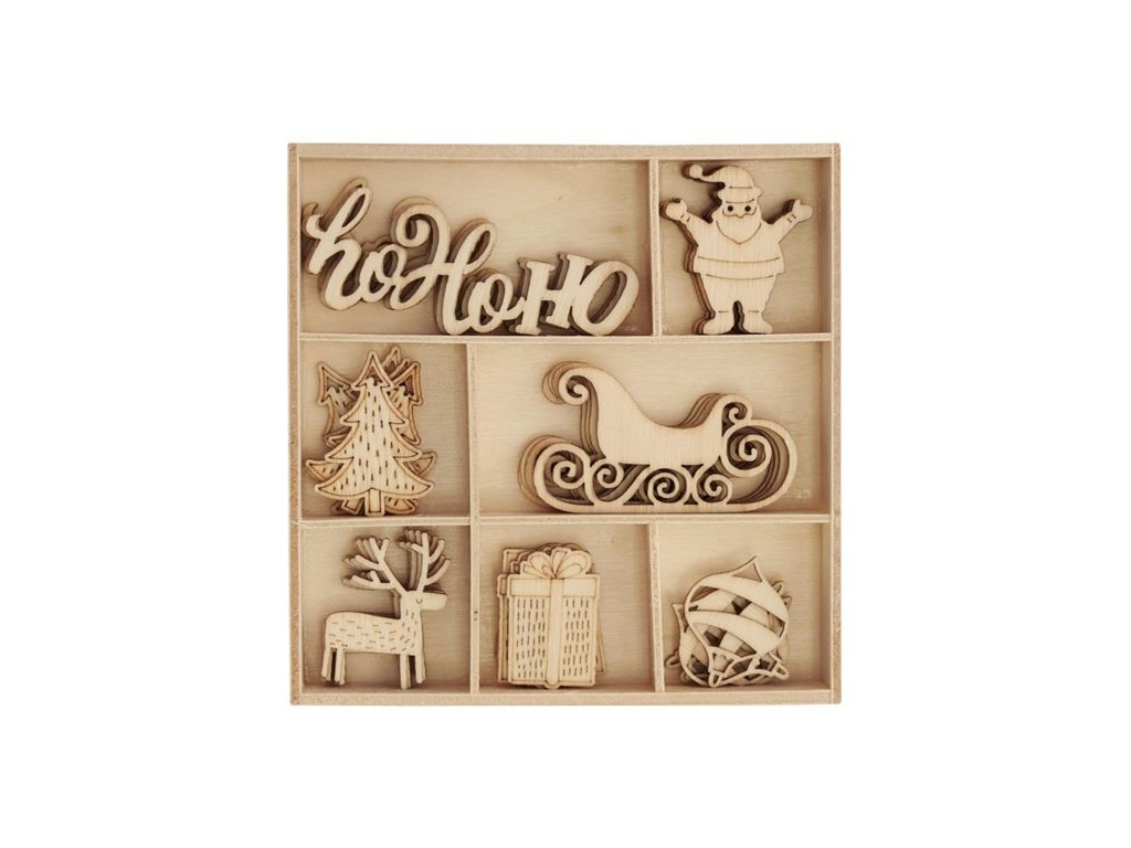 vánoční dřevěné dekoracemotivy: 7 různých motivů - nápis HOHOHO, Santa Claus, sáně, stromeček, sob, dáreček, vánoční ozdoba na stromečekvhodné k dekoraci, papírovému či jinému tvoření balení obsahuje 35 ks dekorací velikost dekorací různé rozměry cca - nápis 6cm, sáně 5 cm, ostatní výška 2-3cmmateriál: přírodní dřevo dekorace jsou v dřevěném boxu ideální pro zdobení vánočních přání, krabiček a tašek na drobnosti upozornění: Nevhodné pro děti do 3 let. Nebezpečí polknutí malých části. Obalové části udržujte mimo dosah dětí.