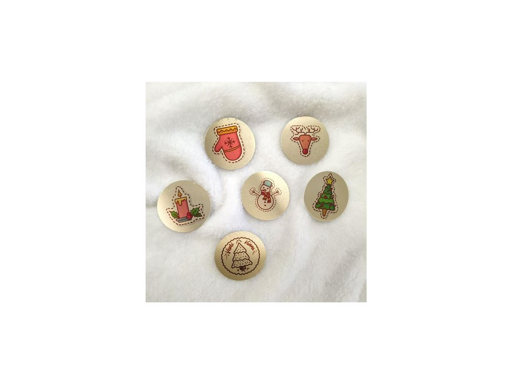 kolečko z hliníku o tloušťce 0,55 mm jednostranně potištěné matná zlatá barva plechu z potištěné strany (druhá strana šedá matná) nejsou samolepicí (při použití je lze podlepit oboustrannou samolepicí páskou) průměr 38 mm 6 ks v balení (6 motivů) použití: k dekoraci obálek, přání, dárků, dárkových tašek, alb či jiných kreativních projektůVýrobek není hračka, nevhodné pro malé děti.