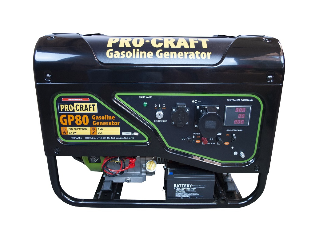 Elektrocentrála Procraft GP80 je určena k použití jako nezávislý generátor elektrického proudu při výpadcích elektřiny, jako zdroj energie při stavebnictví, v domácnosti, kde není elektrická síť dostupná. Díky vysokému výkonu umožňuje napájení nejen domácích spotřebičů, ale i spotřebičů indukčního typu. Elektrocentrála má palivovou nádrž o objemu 25l, čím zaručí dlouhý nepřetržitý provoz. Elektronický start zajišťuje rychlé spuštění benzinového motoru. Robustní ochranný rám umožňuje použití elektrocentrály v jakýkoliv podmínkách a taky usnadňuje transportování. Součástí dodávky jsou elektrická zástrčka, 2 rukojeti, 2 kola, klíč na svíčku. Balení karton. Přepětová ochrana AVR.