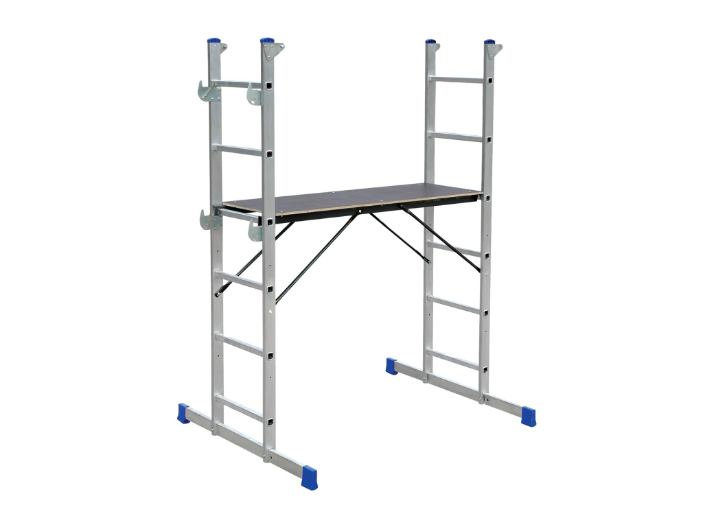 Možnost úpravy na schody. Široká plošina zabezpečuje vysoký komfort při práci. Možnost úpravy na dvojitý a výsuvný žebřík. Je vhodná pro domácí i profesionální použití. Protiskluzové botky zajišťují stabilitu plošiny / žebříku.