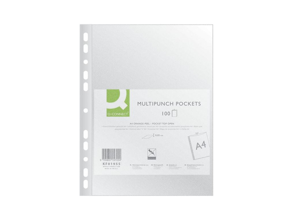 Prospektové závěsné obaly Q-Connect, určené pro dokumenty formátu A4Typ U - otevřené shoraFormát: A4EuroperforaceTloušťka materiálu: 50 micBarva: čirá, matná povrchová úpravaBalení obsahuje 100 ks