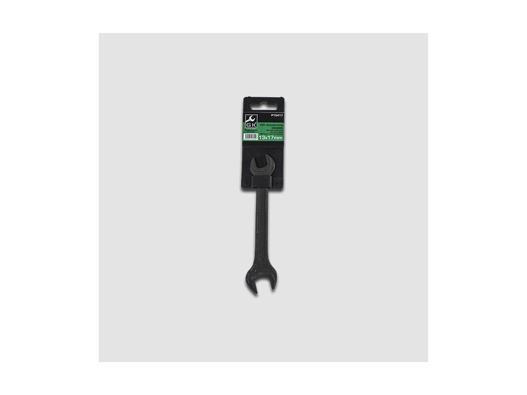 Oboustranný maticový klíč s černěným povrchem. Profilované tělo, otevřené ploché čelisti.