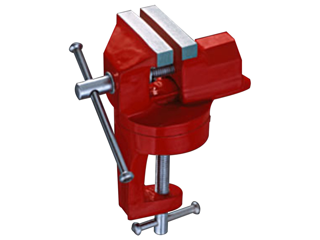 Malý svěrák s upínácím mechanismem k pracovní desce stolu. Otočná hlava o 360°