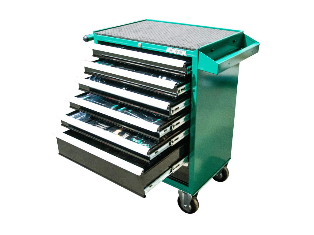 Kovový montážní vozík na nářadí se 7 zásuvkami. Dvě pevná a dvě otočná kola s poziční brzdou. Zásuvky s kuličkovými ložisky lze vysunout do 40 cm. Horní pracovní plocha i zásuvky jsou vypodloženy protiskluzovou podložkou. Držadlo pro manipulaci s vozíkem lze umístit z pravé i levé strany. Součástí je 5 nízkých a 2 vysoké uzamykatelné zásuvky.