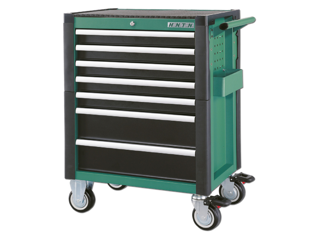Kovový montážní vozík na nářadí se 7 zásuvkami. Dvě pevná a dvě otočná kolečka s poziční brzdou. Zásuvky na kuličkových ložiskách lze vysunout do 40cm. horní pracovní plocha i zásuvky jsou vypodloženy protiskluzovou podložkou. Součástí jsou uzamykatelné zásuvky. Má 5 nízkých a 2 vysoké zásuvky.