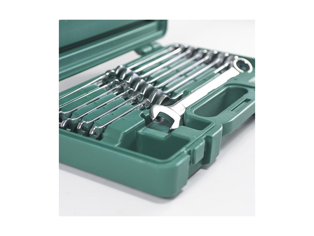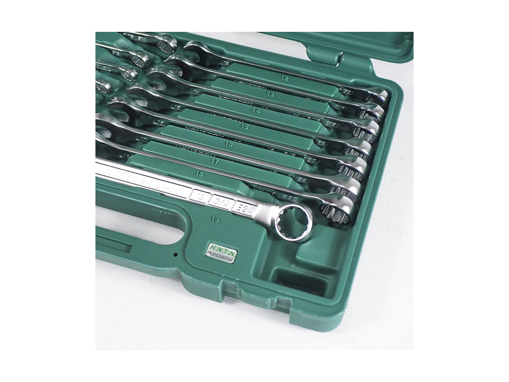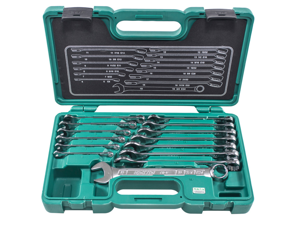 Sada 14-ti očkoplochých klíčů v plastovém kufříku. klíč očkoplochý: 6mm, E8; 7mm, 9/32"; 8mm, 5/16";, E10; 9mm, 11/32", E11;10mm, 3/8", E12; 11mm, 7/16", E14; 12mm, 15/32" E15;13mm,1/2", E16; 14mm, 9/16", E18; 15mm, 1/32" E18;16mm, 5/8", E20; 17mm, 21/32", E20; 18mm, 11/16", E22; 19mm,3/4", E25