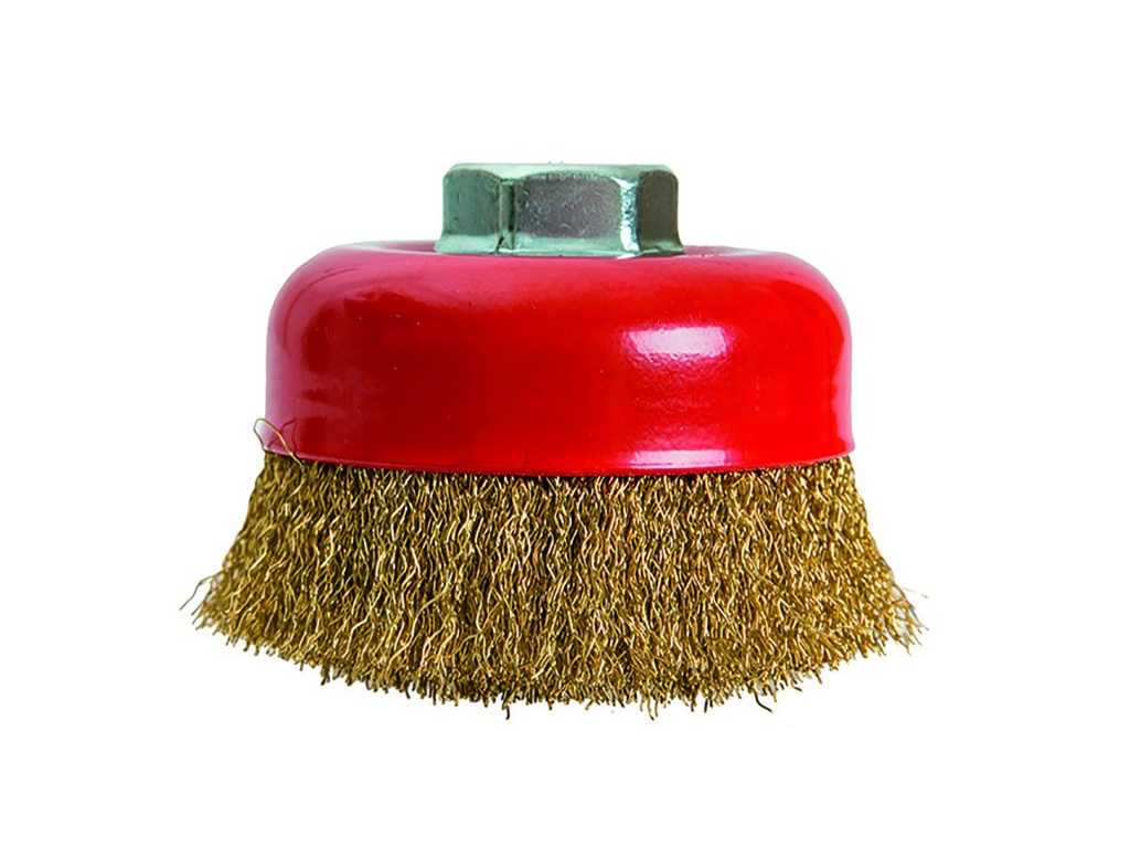 Kartáč miskový s mosaznými vlnitými drátky, uchycení M14, hrnkový, vhodné pro nerezové materiály.