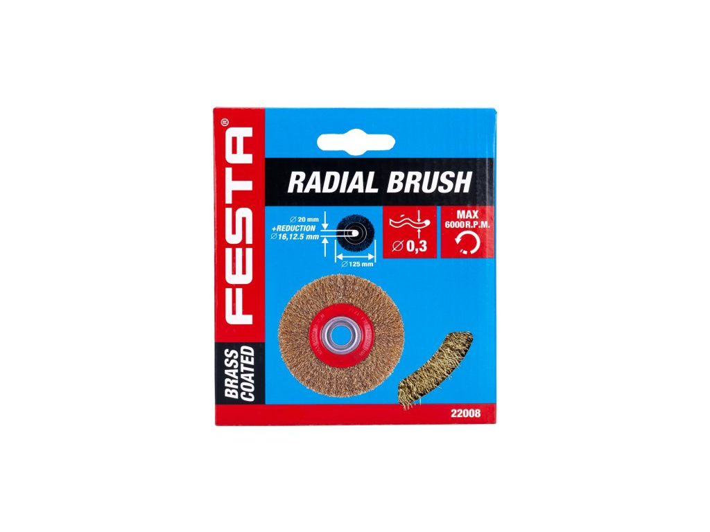 Rotační kartáč - okružní, provedení : vlnitý drát, drát 0,3mm, kartáče FESTA zaručují kvalitní použité materiály i zpracování, průměr 125 mm, uchycení otvor 20 mm (včetně redukčních kroužků 12,5 a 16 mm), počet drátů 4950, délka drátů 22 mm, maximální otáčky za min. 6000, vhodný pro zámečnické a kovoobráběcí práce, odstraňování rzi, barev, leštění.… , balení : papírový box.