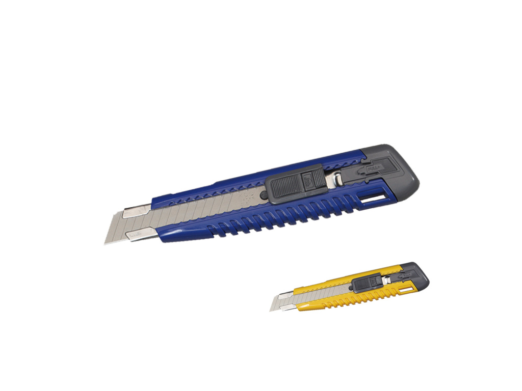 Ulamovací nůž s kovovou vodící lištou a zásobníkem na náhradní čepelky.