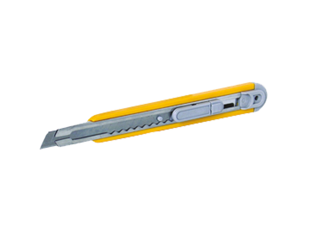 Ulamovací nůž s kovovou vodící lištou a zásobníkem na náhradní čepelky.