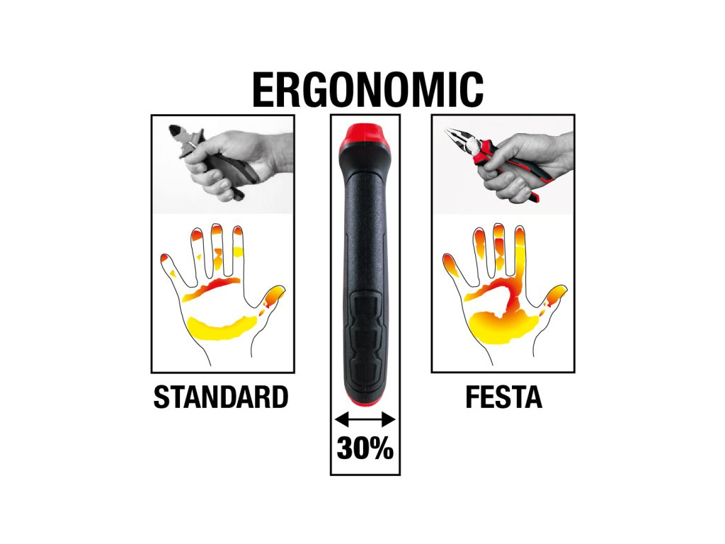 - ergonomické dvoukomponentní měkčené rukojeti, při úchopu a stisku o 30% více kontaktu s rukojetí - redukuje množství potřebné síly