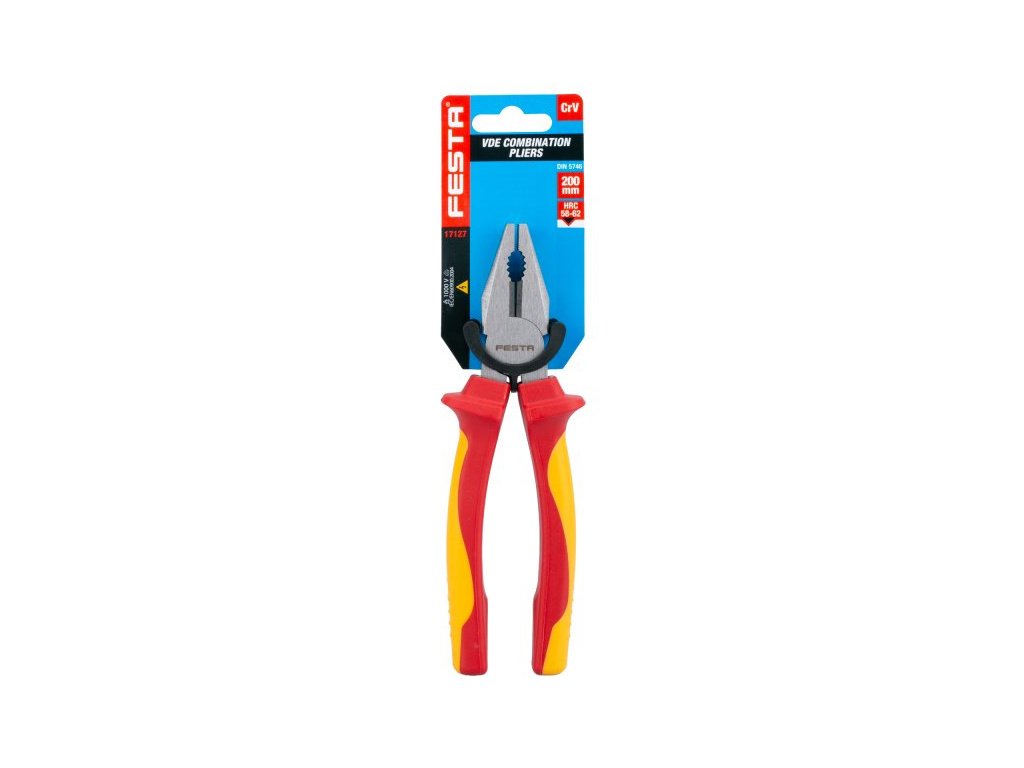 Kleště VDE kombinačky 200 mm FESTA mají certifikaci elektro VDE 1000 V, IEC/EN 60900-2004, kombinace polypropylenu a pryže na ergonomicky tvarovaných ručkách zaručuje výborné antiskluzové vlastnosti a dobrou odolnost vůči mazadlům a chemikáliím. Uchopovací čelisti obzvláště odolné proti opotřebení, chromvanadová vysoce výkonná ocel. Hmotnost 0,383 kg.