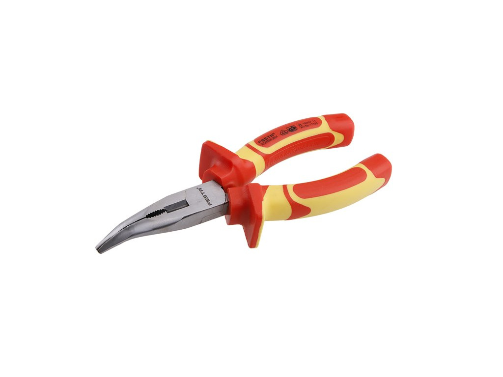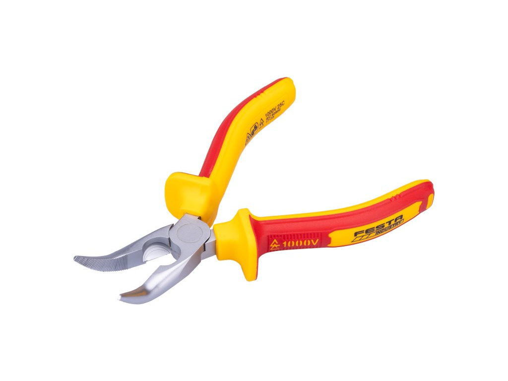 Kleště VDE radiové zahnuté160 mm FESTA mají certifikaci elektro VDE 1000 V, IEC/EN 60900-2004, kombinace polypropylenu a pryže na ergonomicky tvarovaných ručkách zaručuje výborné antiskluzové vlastnosti a dobrou odolnost vůči mazadlům a chemikáliím. Uchopovací čelisti obzvláště odolné proti opotřebení, chromvanadová vysoce výkonná ocel. Hmotnost 0,233 kg.