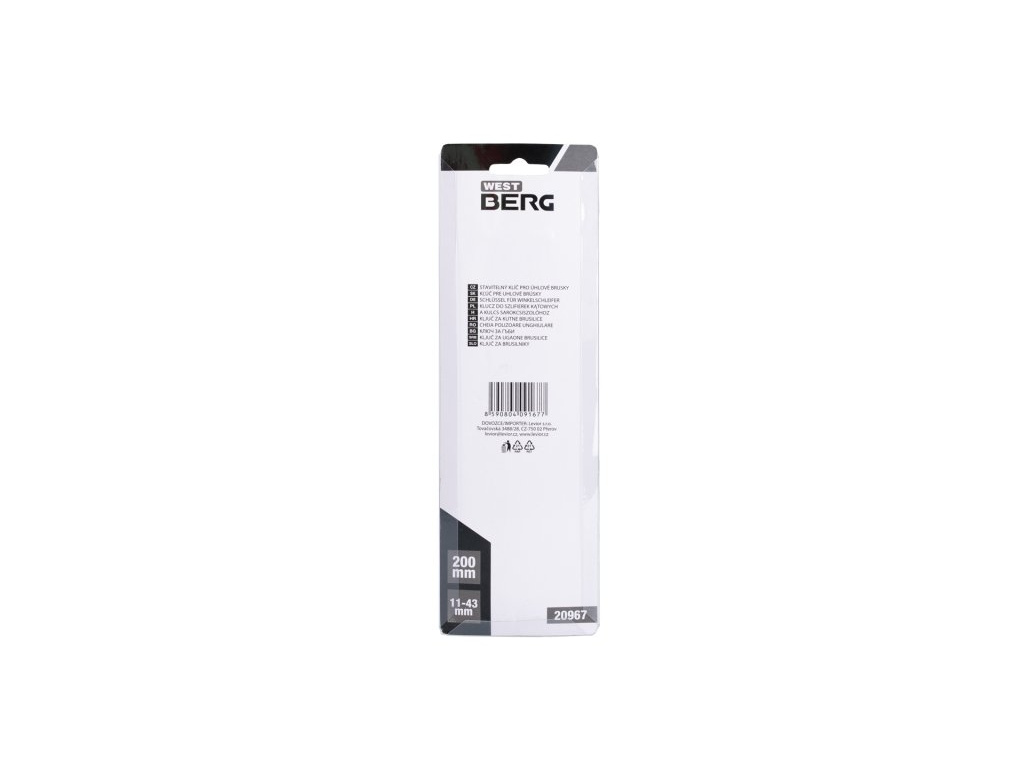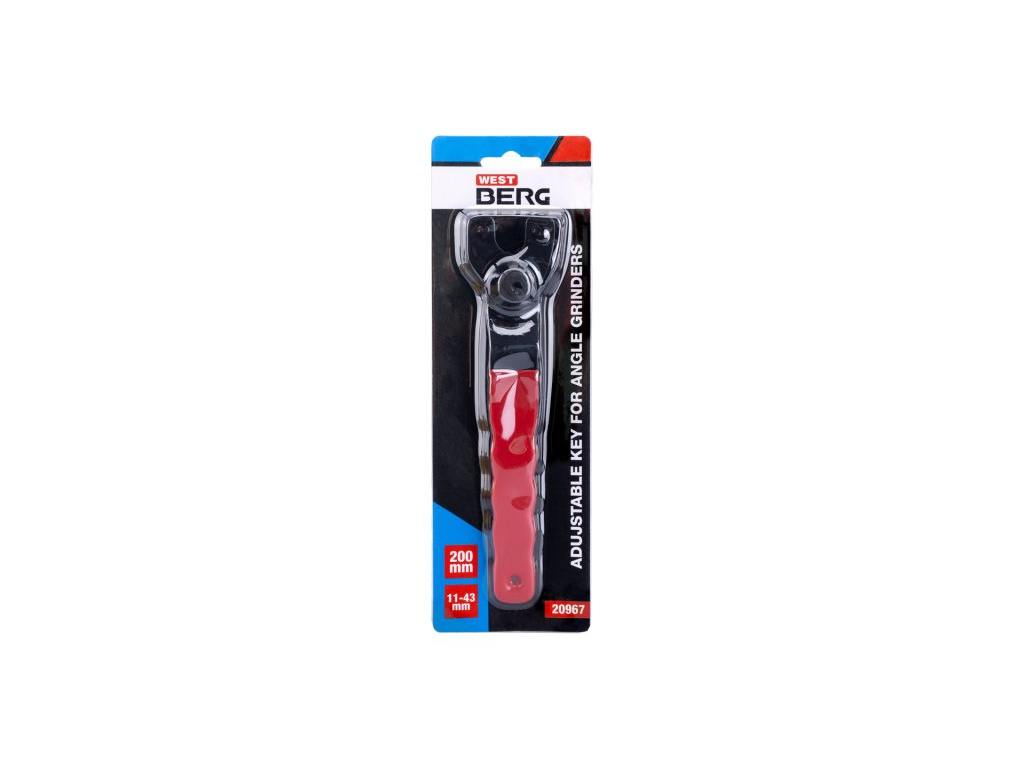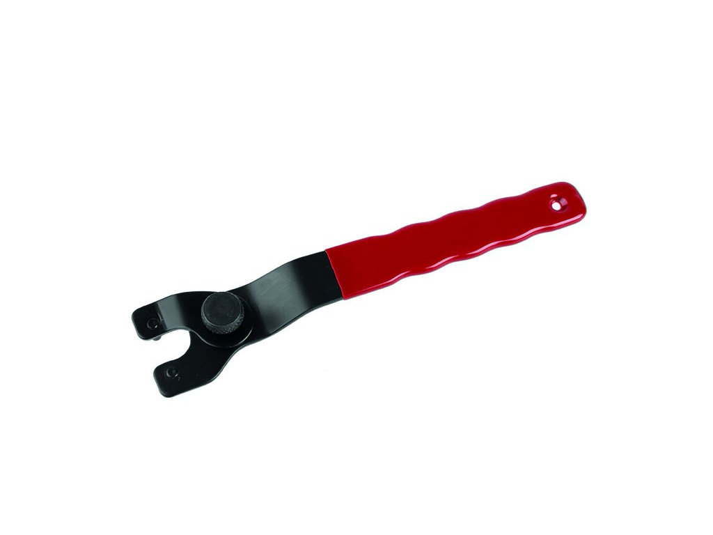 Klíč na utažení matic úhlových brusek, výhodou klíče je, že je jedno rameno pohyblivé a umožňuje tak variabilní přizpůsobení různým roztečím (od 11 do 43 mm) na maticích uhlových brusek od různých výrobců.