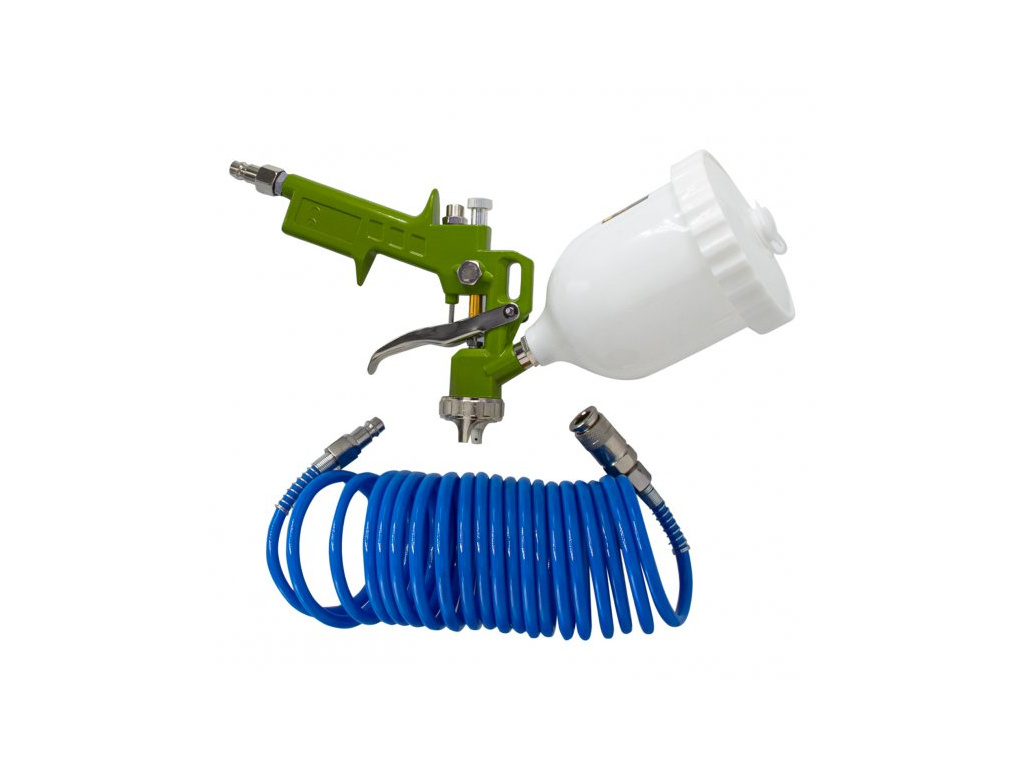 - Pískovací pistole: Tryska o průměru 2 mm, pracovní tlak 5 barů, nádoba na 1000 ml abraziva.