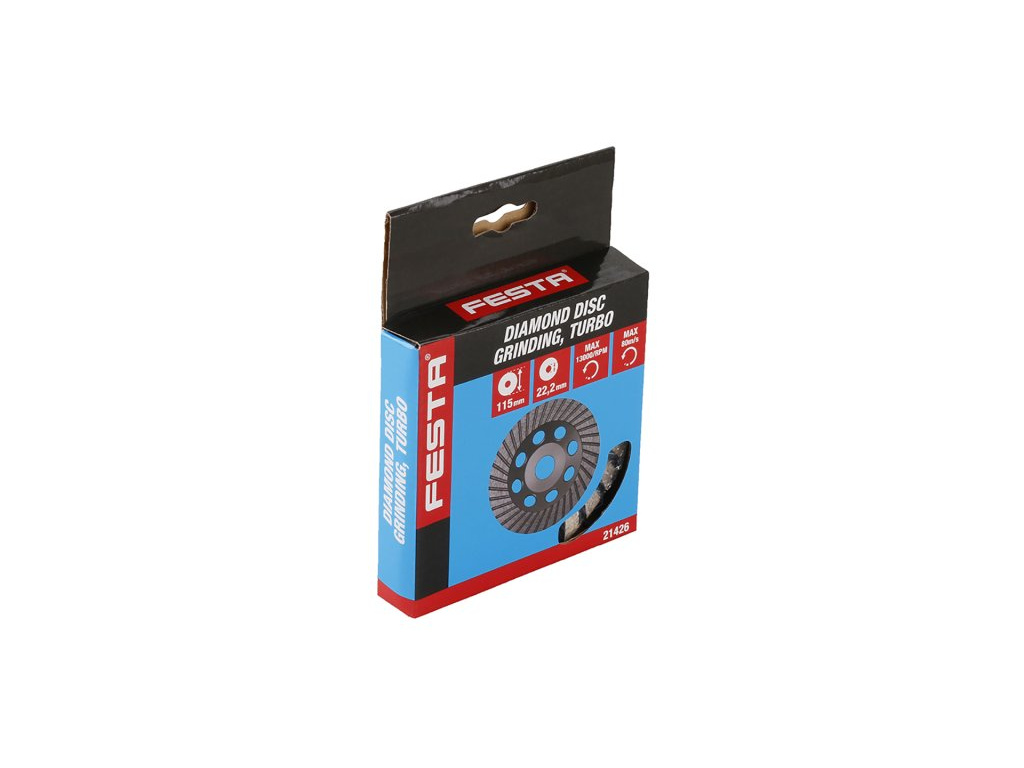 Brusný diamantový kotouč FESTA turbo, robustní nosný talíř je z pevné slitiny, speciální konstrukce uchycení diamantových segmentů k nosnému disku kotouče, vysoký obsah diamantového prachu v segmentech, použití : pro suché broušení mramoru, žuly, cihel, zdiva, přírodního i umělého kamene, obkladů, dlažeb..., lamelové provedení je vhodné pro jemné dobrušování, rozměry : uvedeny v názvu výrobku, balení : papírový box s eurootvorem.