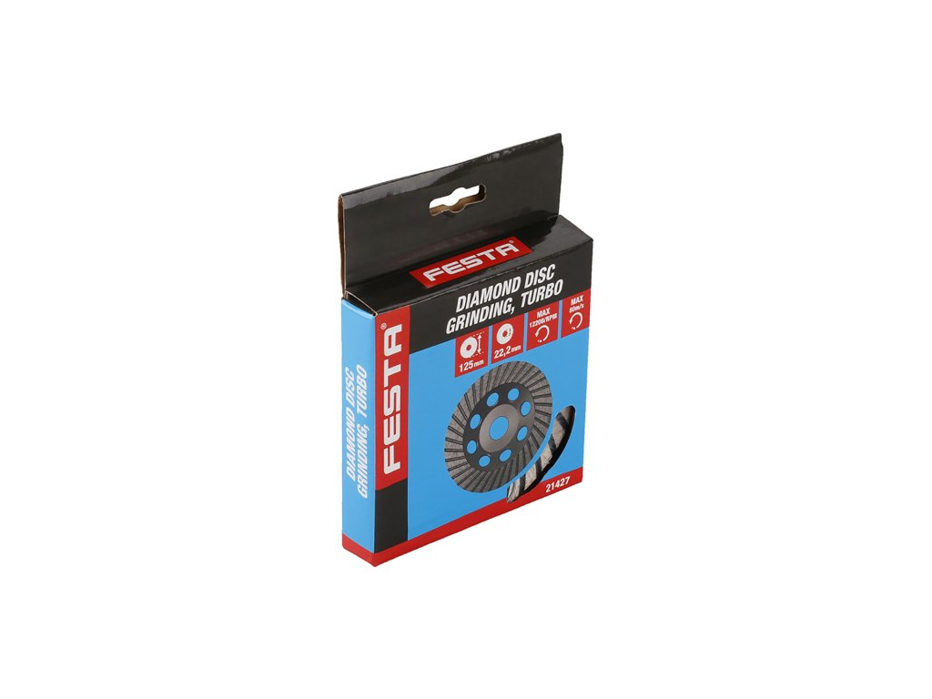 Brusný diamantový kotouč FESTA turbo, robustní nosný talíř je z pevné slitiny, speciální konstrukce uchycení diamantových segmentů k nosnému disku kotouče, vysoký obsah diamantového prachu v segmentech, použití : pro suché broušení mramoru, žuly, cihel, zdiva, přírodního i umělého kamene, obkladů, dlažeb..., lamelové provedení je vhodné pro jemné dobrušování, rozměry : uvedeny v názvu výrobku, balení : papírový box s eurootvorem.