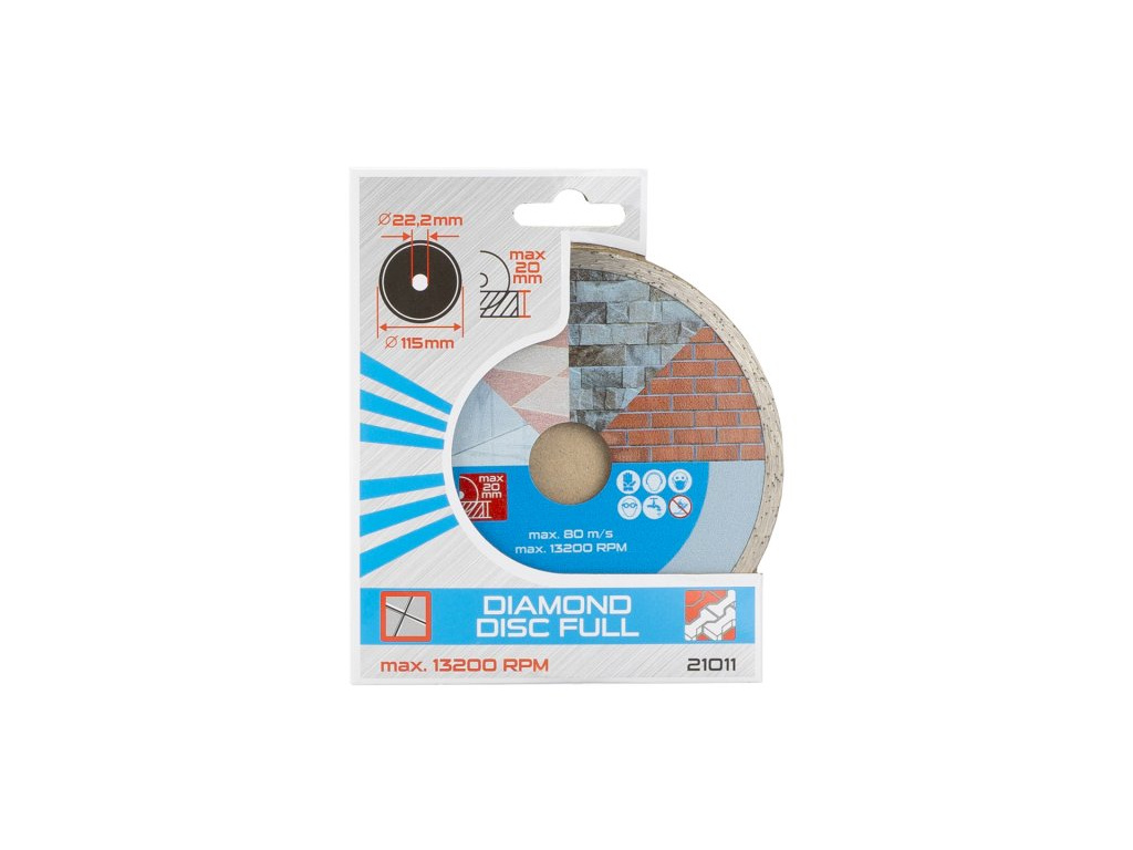 Diamantový kotouč DIAMANT, provedení : PLNÝ - celoobvodový, kvalitní diamantová vrstva s vysokým obsahem diamantového prachu, přesné zpracování - napojení na nosný disk kotouče odolávající vysokým teplotám, použití : určený pro mokré i suché řezání dlažby a obkladů, betonu, cihel, zdiva, žuly, mramoru, kamene, skla, keramiky, balení : blistr s eurootvorem, přiložen redukční kroužek z 22,2 na 20 mm, rozměry : uvedeny v názvu výrobku.