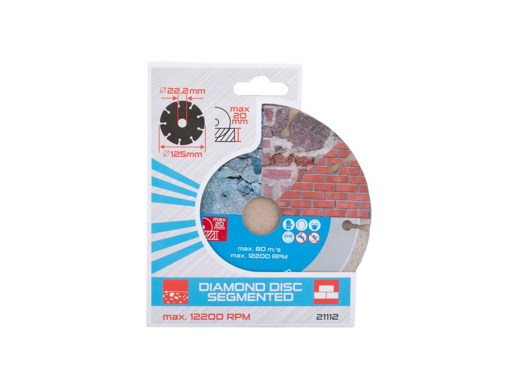 Diamantový kotouč DIAMANT, provedení : SEGMENTOVÝ, kvalitní materiály i zpracování - vysoce pevné uchycení diamantových segmentů k nosnému disku kotouče, vysoký obsah diamantového prachu v segmentech, použití : pro suché řezání betonu, cihel, zdiva, kamene, ... , balení : blistr s eurootvorem, přiložen redukční kroužek z 22,2 na 20 mm, rozměry : uvedeny v názvu výrobku.