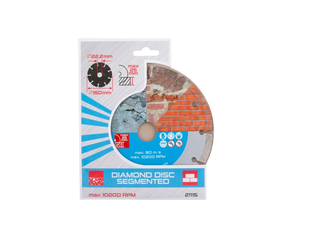 Diamantový kotouč DIAMANT, provedení : SEGMENTOVÝ, kvalitní materiály i zpracování - vysoce pevné uchycení diamantových segmentů k nosnému disku kotouče, vysoký obsah diamantového prachu v segmentech, použití : pro suché řezání betonu, cihel, zdiva, kamene, ... , balení : blistr s eurootvorem, přiložen redukční kroužek z 22,2 na 20 mm, rozměry : uvedeny v názvu výrobku.