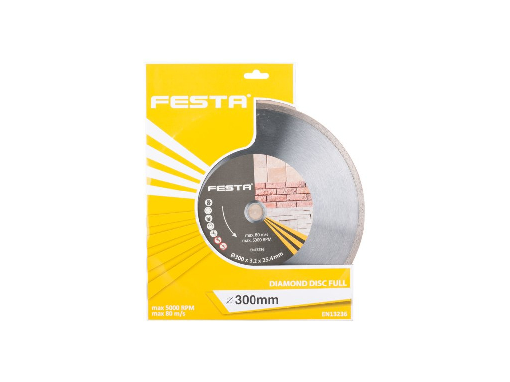 Profesionální diamantový kotouč FESTA, provedení : PLNÝ - celoobvodový, kvalitní diamantová vrstva s vysokým obsahem diamantového prachu, přesné zpracování - napojení na nosný disk kotouče odolávající vysokým teplotám, použití : určený pro mokré i suché řezání dlažby a obkladů, betonu, cihel, zdiva, žuly, mramoru, kamene, skla, keramiky, balení : blistr s eurootvorem, rozměry : uvedeny v názvu výrobku.