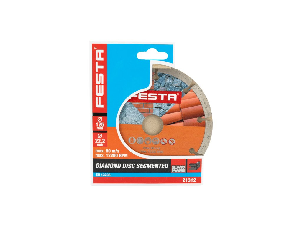 Profesionální diamantový kotouč FESTA, provedení : SEGMENTOVÝ, kvalitní materiály i zpracování - vysoce pevné uchycení diamantových segmentů k nosnému disku kotouče, vysoký obsah diamantového prachu v segmentech, použití : pro suché řezání betonu, cihel, zdiva, kamene, ... , balení : blistr s eurootvorem, rozměry : uvedeny v názvu výrobku.