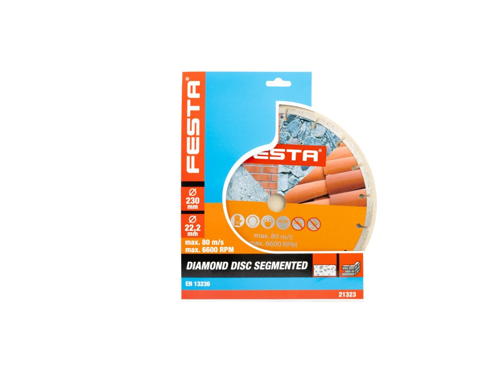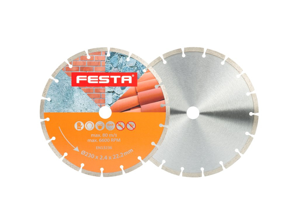 Profesionální diamantový kotouč FESTA, provedení : SEGMENTOVÝ, kvalitní materiály i zpracování - vysoce pevné uchycení diamantových segmentů k nosnému disku kotouče, vysoký obsah diamantového prachu v segmentech, použití : pro suché řezání betonu, cihel, zdiva, kamene, ... , balení : blistr s eurootvorem, rozměry : uvedeny v názvu výrobku.