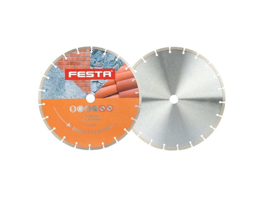 Profesionální diamantový kotouč FESTA, provedení : SEGMENTOVÝ, kvalitní materiály i zpracování - vysoce pevné uchycení diamantových segmentů k nosnému disku kotouče, vysoký obsah diamantového prachu v segmentech, použití : pro suché řezání betonu, cihel, zdiva, kamene, ... , balení : blistr s eurootvorem, rozměry : uvedeny v názvu výrobku.