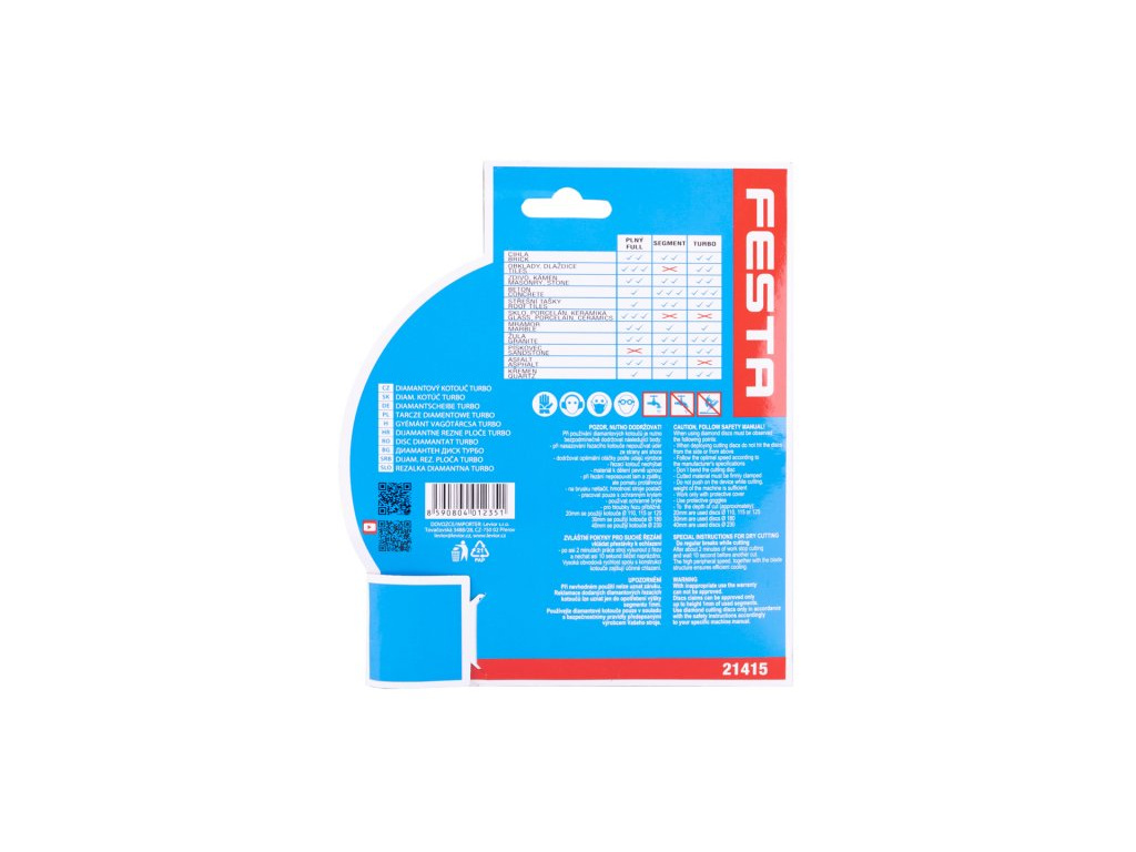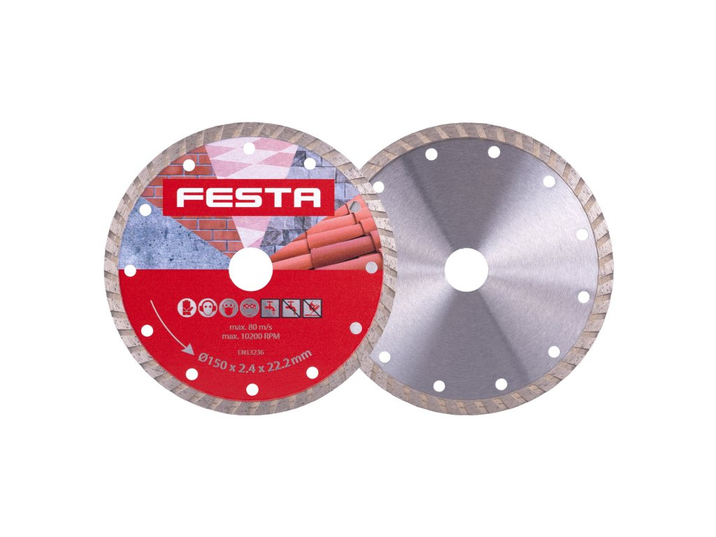Diamantový kotouč FESTA, provedení : TURBO, kvalitní materiály i zpracování, speciální tvar diamantových segmentů i konstrukce a pevné uchycení k nosnému disku kotouče, vysoký obsah diamantového prachu, použití : pro suché i mokré řezání betonu, železobetonu, cihel, zdiva, kamene, balení : blistr s eurootvorem, rozměry : uvedeny v názvu výrobku.
