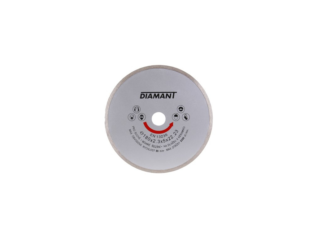 Diamantový kotouč DIAMANT, provedení : PLNÝ - celoobvodový, kvalitní diamantová vrstva s vysokým obsahem diamantového prachu, přesné zpracování - napojení na nosný disk kotouče odolávající vysokým teplotám, použití : určený pro mokré i suché řezání dlažby a obkladů, betonu, cihel, zdiva, žuly, mramoru, kamene, skla, keramiky, balení : blistr s eurootvorem, přiložen redukční kroužek z 22,2 na 20 mm, rozměry : uvedeny v názvu výrobku.