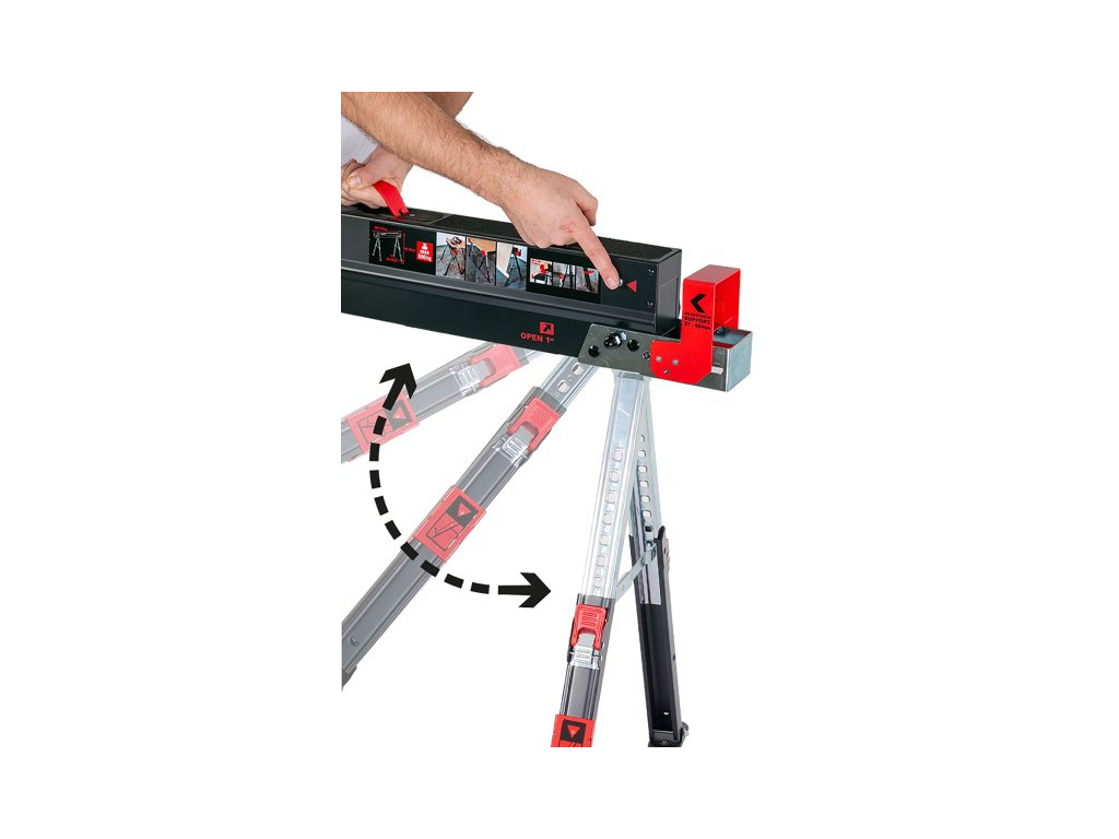 - nosná plocha s protikluznou vrstvou, na jedné straně noh výklopné opěrky pro OSB desky, lamino, apod. s nosností 30 kg na jednu opěrku