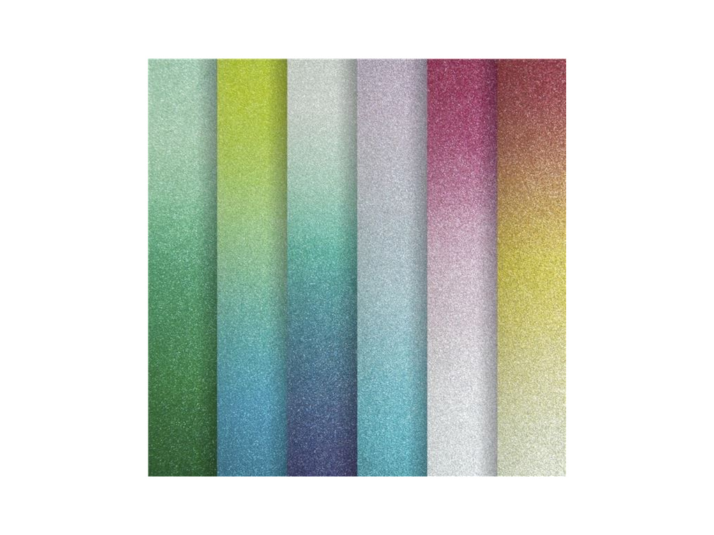 jednostranně třpytivý papír s bílou hladkou zadní stranou vhodný k dekoraci přáníček a jiné tvoření z papíru třpyt je velmi jemný, na dotek hladký, nedrolí se (lze stříhat nůžkami nebo řezačkou) formát A4 gramáž 230 g/m2 mix stínovaných barev (plynulý přechod barvy) balení 6 ks