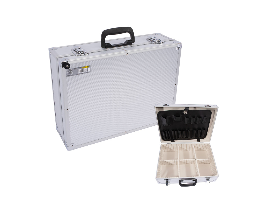Hliníkový kufr na nářadí má nastavitelné vnitřní přihrádky, které umožňují libovolně přestavět na oddíly.