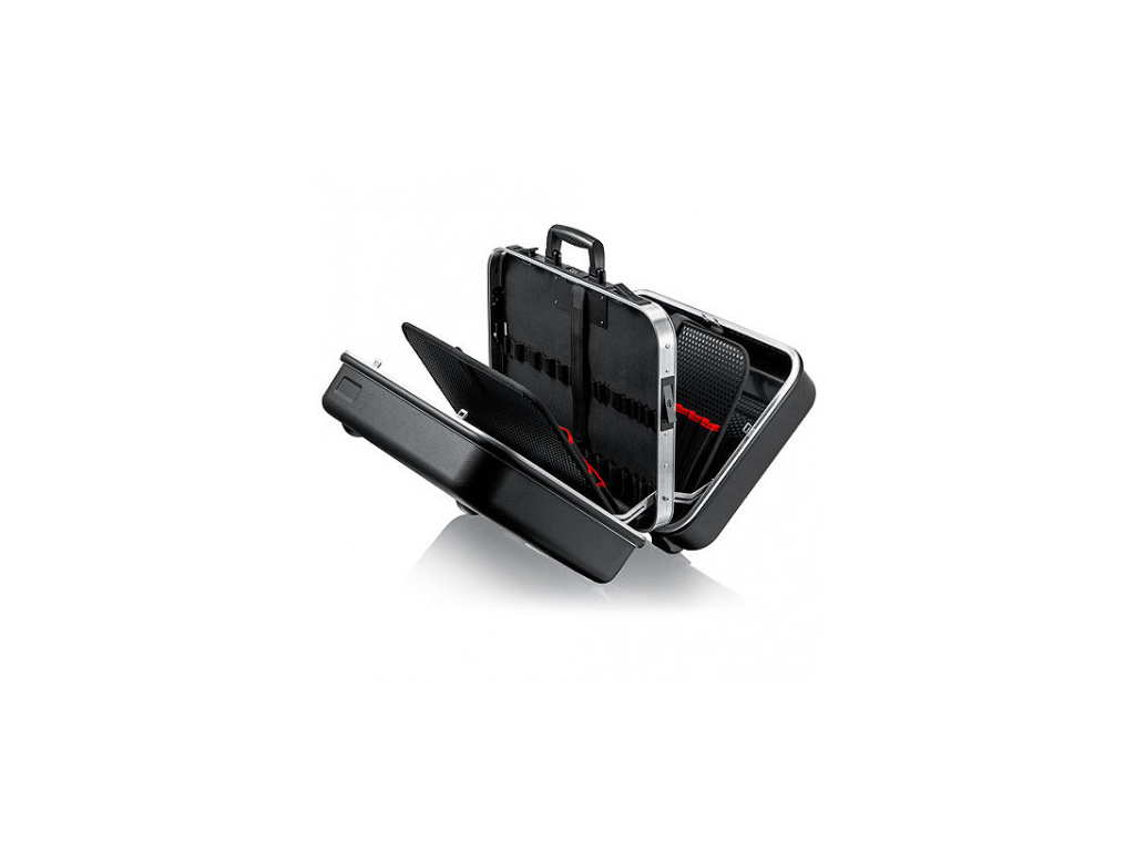 Obvodový hliníkový rám s pevně namontovanou, stabilní, oboustranně osaditelnou středovou stěnou, s mnohostrannými možnostmi zasunutí nářadí díky elastickým páskům a 12ti malým kapsami