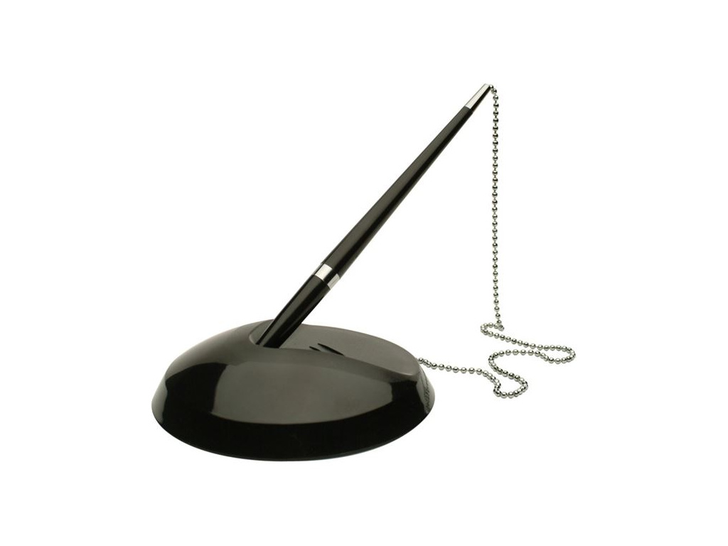 Kuličkové pero s plastovým stojánkem Pero na kuličkovém řetízku dlouhém 58 cmČerné tělo, modrá náplň 3 náhradní náplněSpodní plocha stojánku opatřena samolepicí ploškou Průměr hrotu: 0,7 mmšíře stopy: 0,5 mm