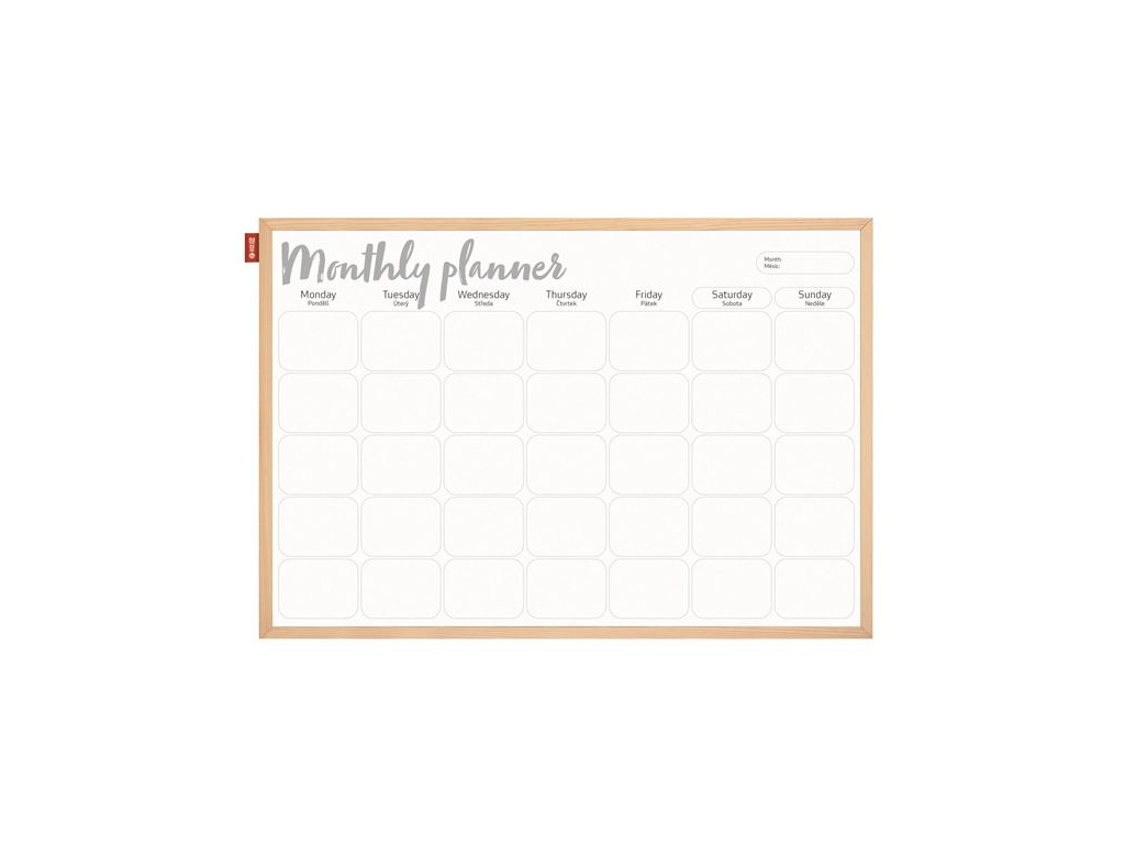 Emailová magnetická tabule popisovatelná a stíratelná za suchaPřehledný měsíčmí plánovací rozvrh na jednom místěFunkční a dekorativní nástroj pro organizaci časuIdeální pro domácnosti, kanceláře, restaurace, hotely a mnoho dalšíchOtěru odolný potisk v černé barvě celkem 35 okenSlouží k přehlednému zobrazení programu jednotlivých dnů měsíceŘádky pro rozpis jednotlivých dnů v týdnuLakovaný kovový povrchLehký, estetický rám z masivního borovicového dřevaHorizontální nebo vertikální uchycení tabuleVčetně montážní sady na stěnuSoučastí balení je stírací houba, popisovač a 3 magnetyTloušťka rámu (podle rozměru tabule): 16-25 mm, tloušťka tabule: 12-40 mmZadní strana dřevovláknitá deskaRozměr: 90 x 60 cm