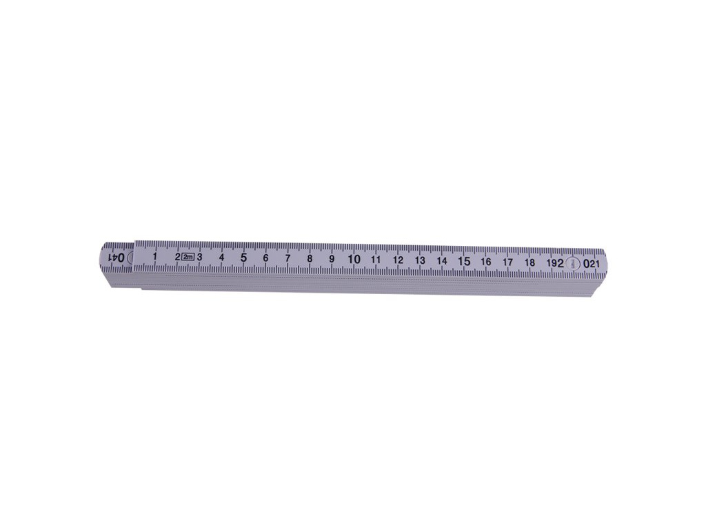 Plastový skládací metr, bílá barva, oboustranná stupnice v mm - dobře čitelný černý potisk, zámky s možností aretece dílku v 90° poloze.