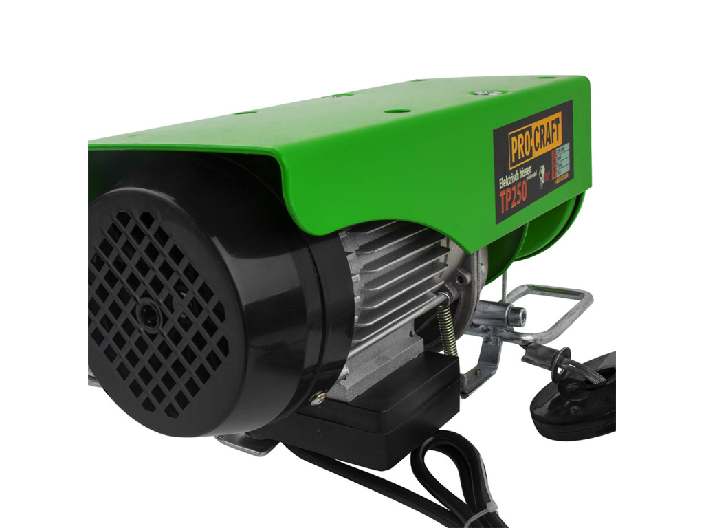 Elektrický lanový naviják Procraft TP250 je určen k spouštění nebo zdvihání pevných břemen. Vysokou nosnost až do 250kg umožňuje silný indukční motor s výkonem 510W. Bez kladky umožňuje zvedání až 125kg na výšku až 12m. Možnost použití s jednoduchým nebo dvojitým závěsem pomocí kladky. Kvalitní ocelové lano a spolehlivý motor zaručuje dlouhou bezporuchovou práci. Součástí dodávky jsou 2 úchytky, ocelové lano. Balení karton.