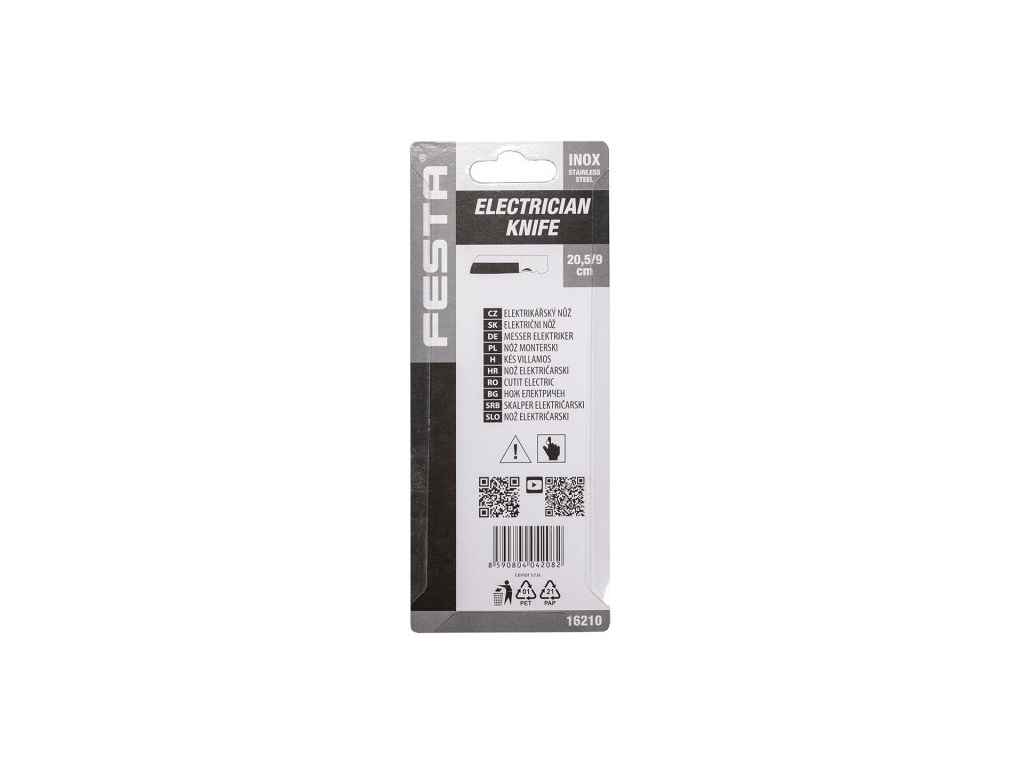 Zavírací elektrikářský nůž s rovnou čepelí, silná čepel se dvojím ostřím usnadňujícím odizolovávání vodičů, pogumovaná ergonomická rukojeť, blistr.