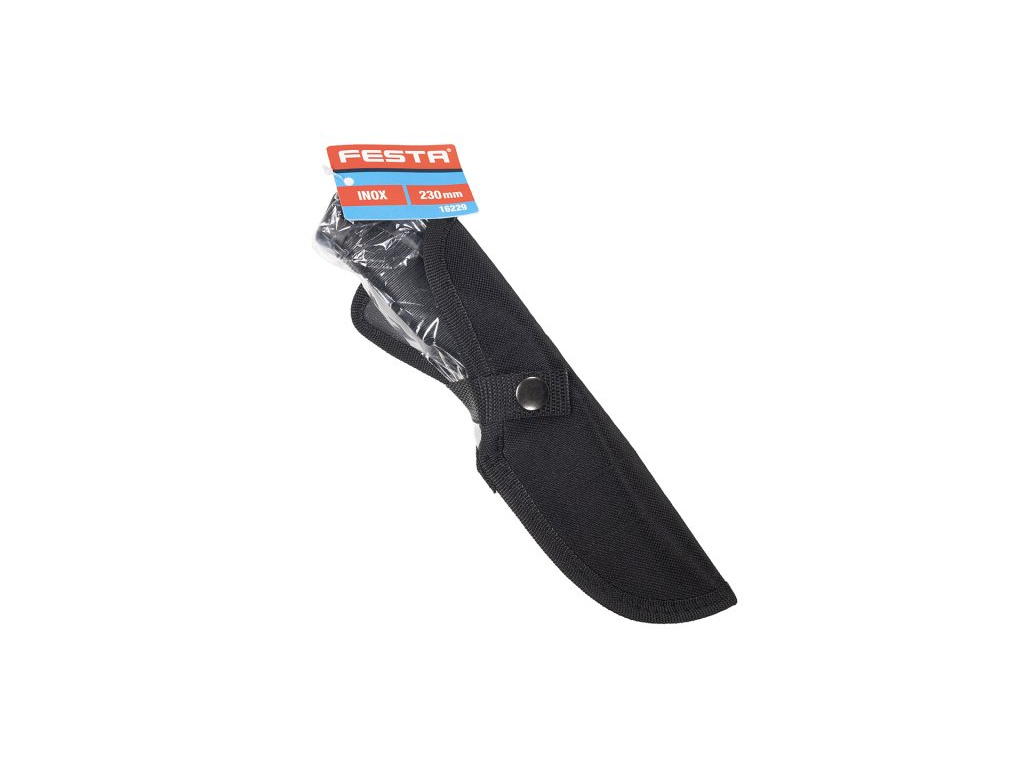 Nerezový lovecký nůž, teflonová povrchová úprava čepele, celková délka 23 cm, ergonomická pogumovaná rukojeť. Nůž není zavírací. Nylonové pouzdro s připnutím na opasek.